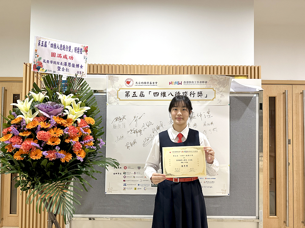 由馮燊均國學基金會及香港教育工作者聯會合辦,「四維八德踐行奬」旨在鼓勵學生及青少年努力實踐道德,樹立良好榜樣,成為有教養、孝敬父母、及奉公守法的好市民。