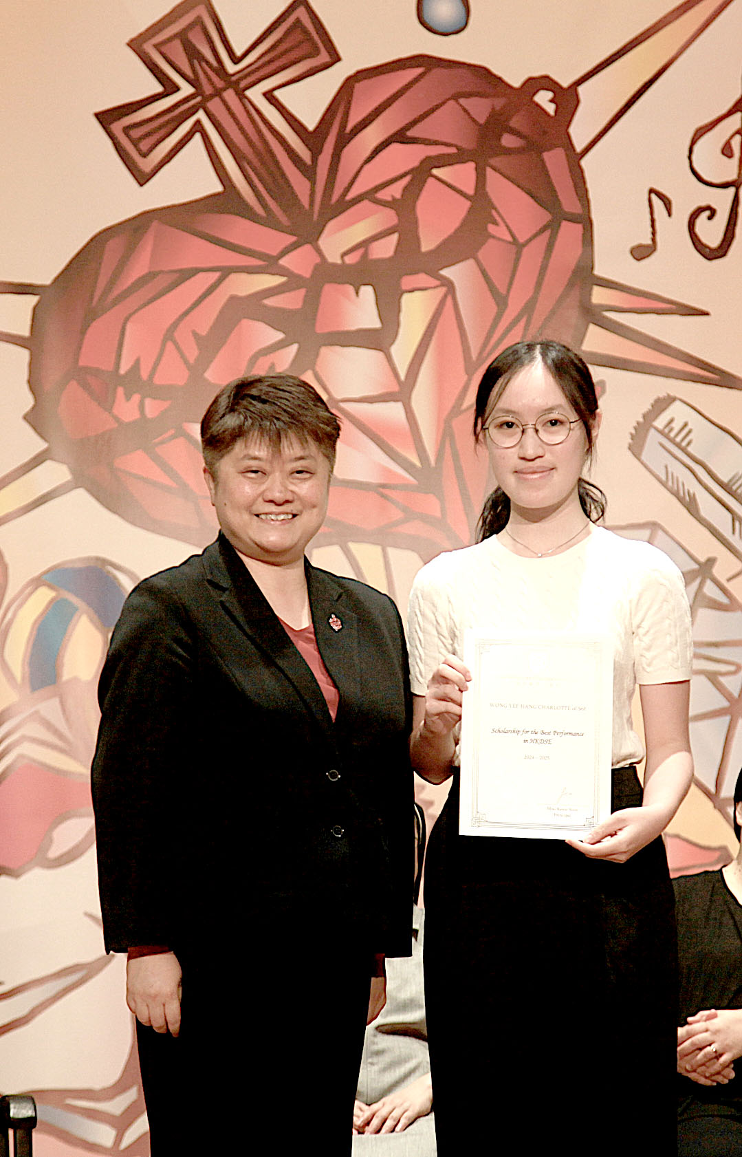 The ceremony also featured a special acknowledgement of academic excellence. Charlotte Wong, a member of the Head Girl Core Group 2024-2025, was presented the Scholarship for Best Performance in the Hong Kong Diploma of Secondary Education (HKDSE). In her speech, she expressed her profound gratitude to the school and the teachers for their unwavering support and guidance. Offering encouragement to the current S6 students preparing for their upcoming DSE examinations, she advised them to diligently seek help from their teachers and to strive for excellence with confidence and determination.